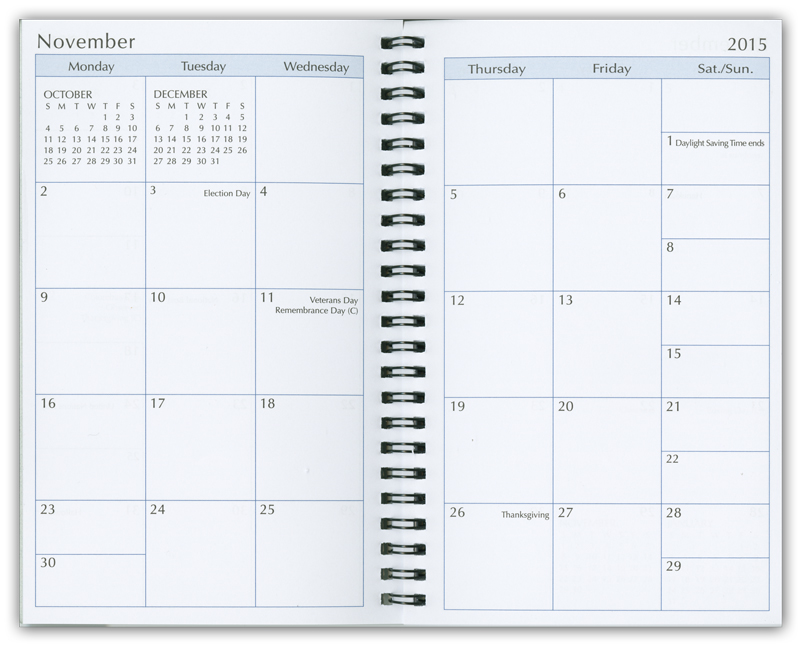 128 pages, white paper. Wire-bound. 52 weekly, 12-month and three-year views. Advance planning (important dates, birthdays, road/air miles, etc) pages included.