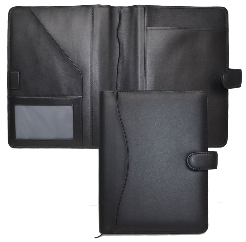 For 8 3/4" x 6 3/4" wirebound inserts; measures 9 3/4" x 7 5/8". Finely textured bonded leather, inside and out, with a magnetic tab closure. Inside, a sewn pen loop, ID pocket, document flap, two pockets for organizer elements, and a top-loading slot for a writing pad. Leather page marker.