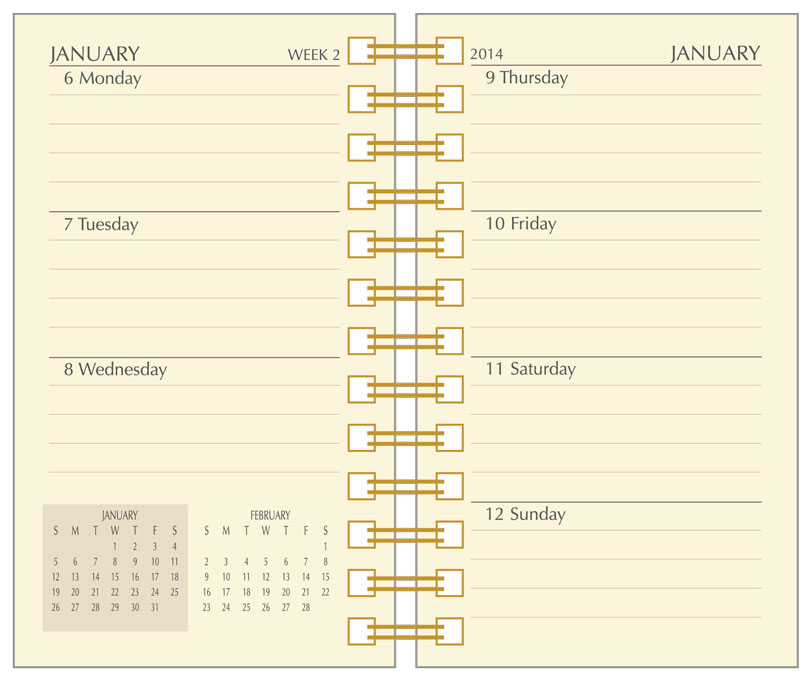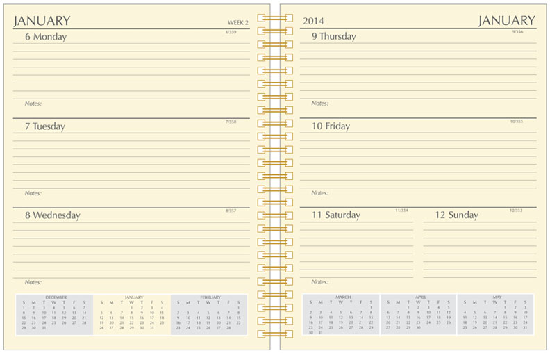 144 pages, white three-hole or seven-hole paper. 52 Weekly and 12 Monthly Views. A 3 year view and advance planning (important dates, birthdays, personal information pages, road/air miles, etc) included.